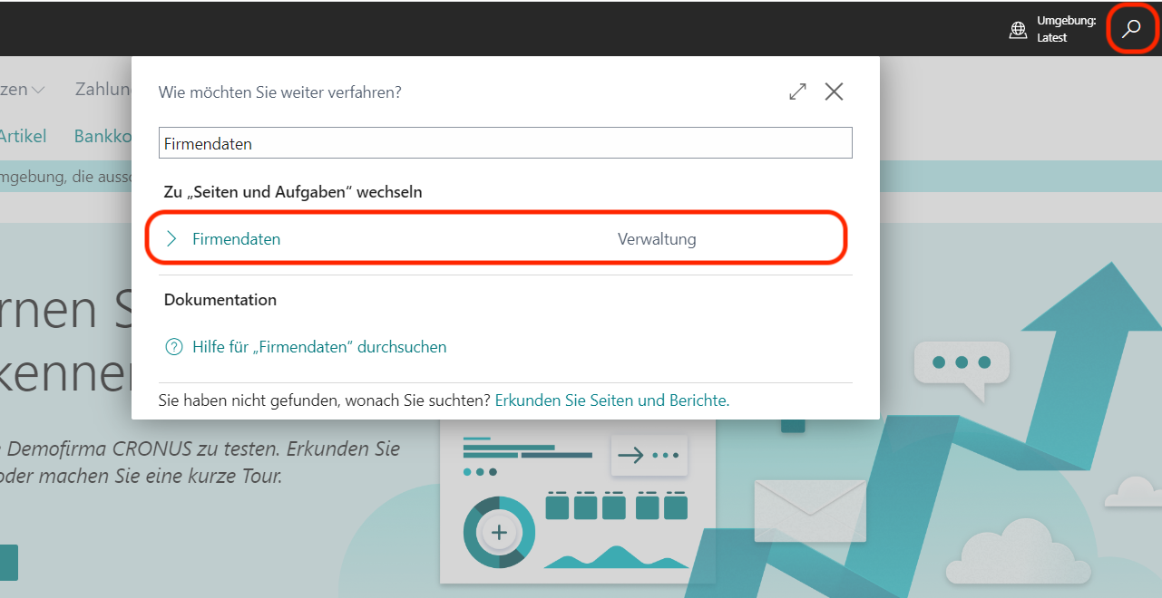 Navigieren Sie über die globale Suche mit dem Stichwort ´Firmendaten´ in die Einstellungen über Ihre Firma.